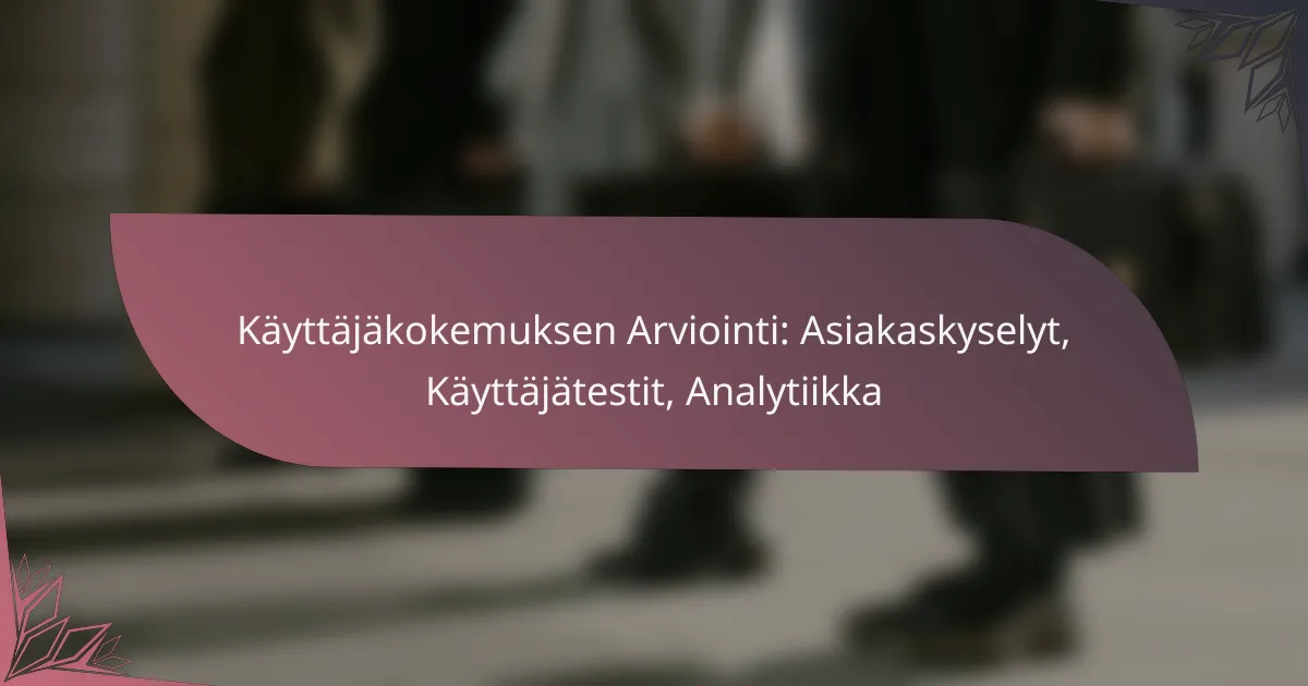 Käyttäjäkokemuksen arviointi on olennainen osa palveluiden ja tuotteiden kehittämistä, ja se perustuu asiakaskyselyihin, käyttäjätesteihin ja analytiikkaan. Nämä menetelmät yhdessä tarjoavat syvällistä tietoa asiakkaiden tarpeista ja käyttäjäystävällisyydestä, mikä mahdollistaa palveluiden jatkuvan parantamisen. Huolellisesti suunnitellut kyselyt ja tehokkaat käyttäjätestit auttavat keräämään arvokasta palautetta, joka ohjaa kehitystyötä.