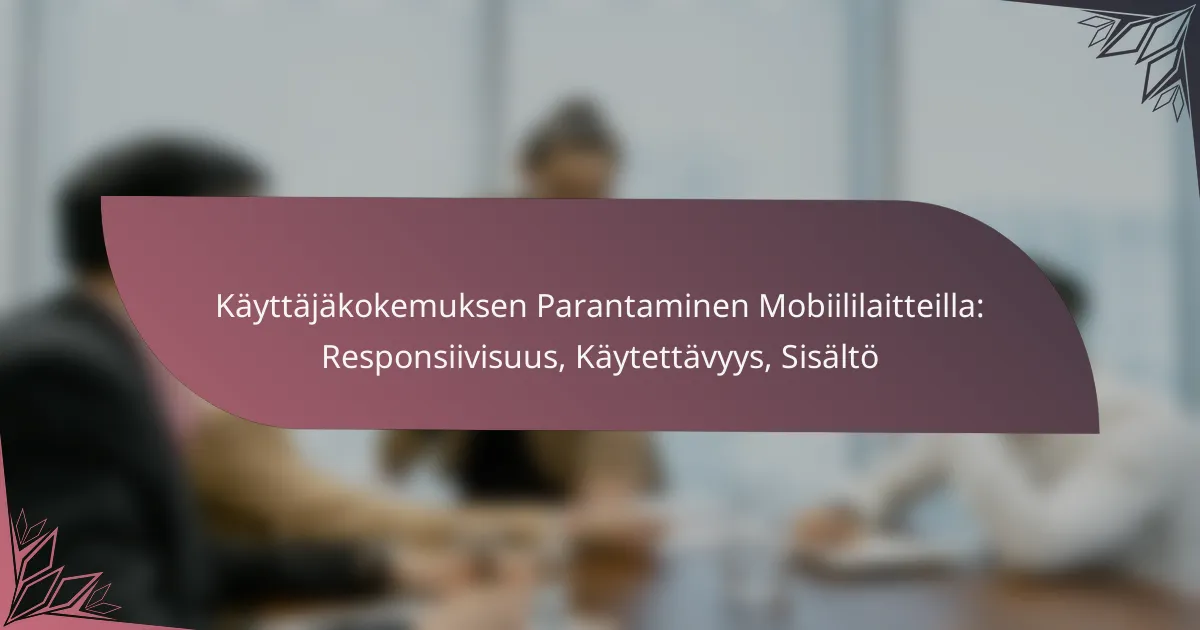 Käyttäjäkokemuksen parantaminen mobiililaitteilla keskittyy responsiivisuuteen, käytettävyyteen ja sisällön optimointiin. Nämä elementit yhdessä varmistavat, että käyttäjät saavat sujuvan ja miellyttävän kokemuksen, mikä lisää sitoutumista ja tyytyväisyyttä.